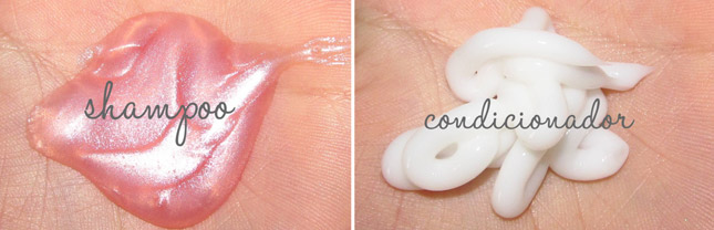 O shampoo: ele não é transparente como pensei, e sim translúcido. Rosa avermelhado com brilhinhos prata, coisa linda. Limpa super bem o cabelo e promete dar brilho. Posso garantir que cumpre! Essa é melhor parte dele: O brilho! A textura é bem grossa e espalha bem nos fios
