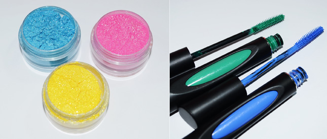 Além dos batons também recebi 3 pigmentos lindos e duas máscaras de cílios coloridas, uma verde e uma azul. As máscaras deixam os cílios bem coloridos mesmo, fica muito legal pra quem gosta do efeito. As sombras são super intensas e muuuuito cintilantes.
